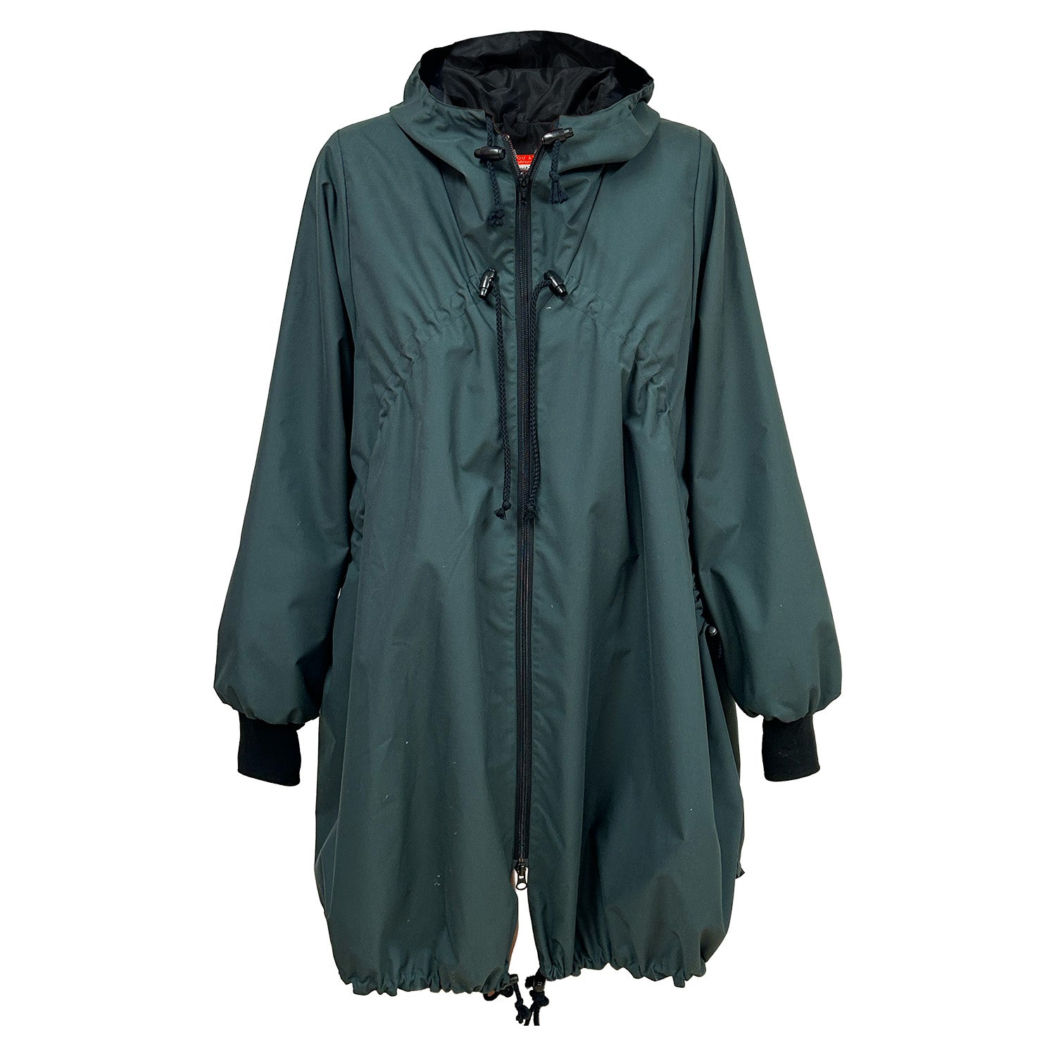 Coat with hood, 2-way zipper and side seam pockets. The fabric is breathable, windproof and waterproof. The lining is made of a lightweight polyester quality. The coat is spacious and half-length with set-in sleeves. It features stitched channels with adjustable drawstrings to shape the silhouette. The sleeves end with a black cotton-lycra cuff.