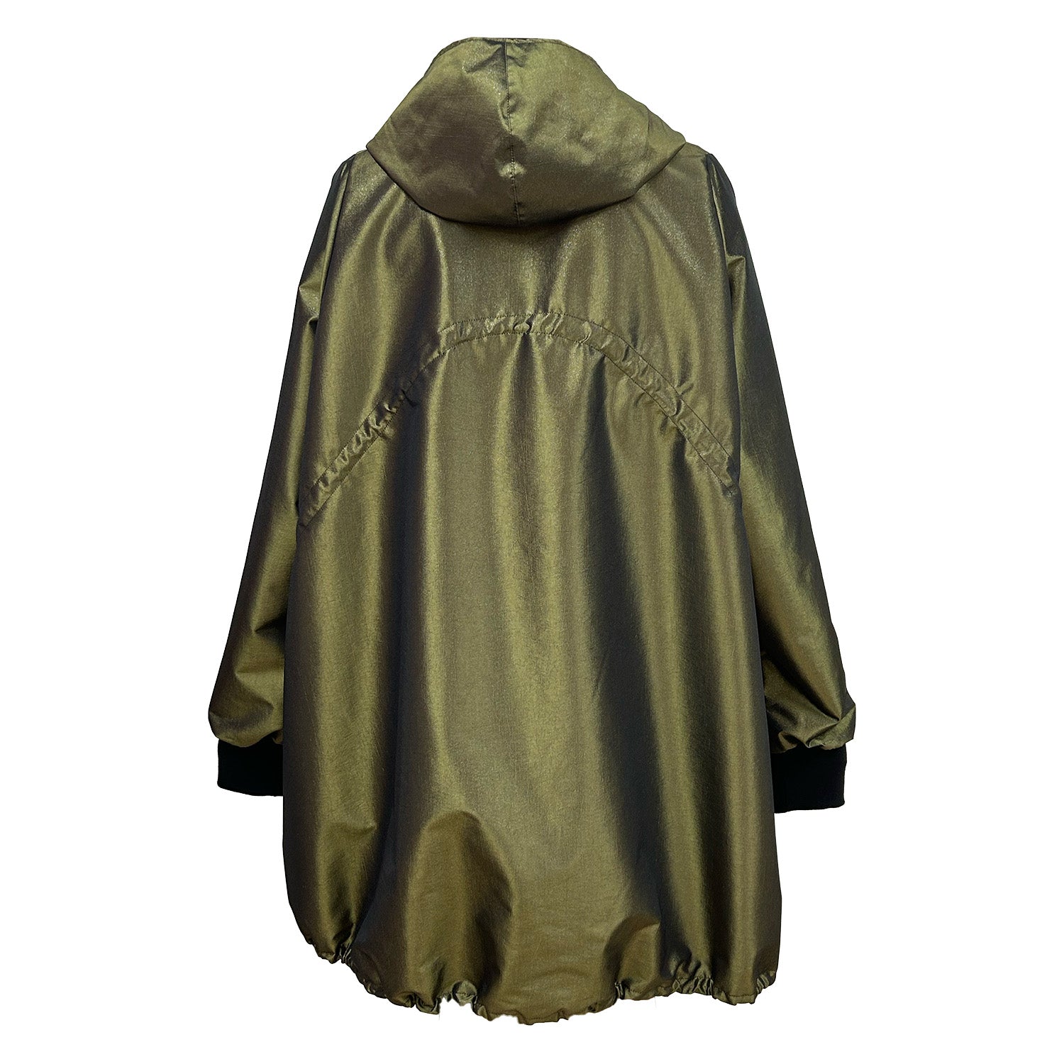 Coat with hood, 2-way zipper and side seam pockets. The fabric is breathable, windproof and waterproof. The lining is made of a lightweight polyester quality. The coat is spacious and half-length with set-in sleeves. It features stitched channels with adjustable drawstrings to shape the silhouette. The sleeves end with a black cotton-lycra cuff.